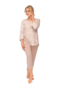 Pyžamo 738 Regina béžové - dámská bavlněná košile s otevřeným výstřihem, zapínáním na knoflíky a kapsami, 7/8 kalhoty