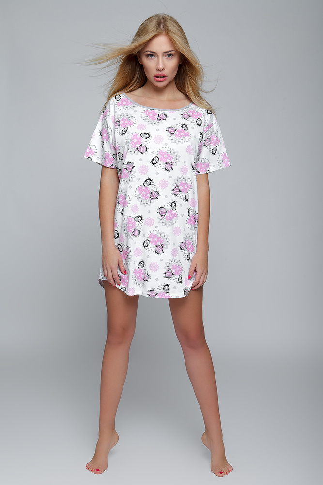 Dámská košile z vysoce kvalitní 100% bavlny, která v kombinaci s volným střihem poskytuje maximální pohodlí při nošení. Zajišťuje naprostou volnost pohybu. Originální velký výstřih, který lze sexy přehodit přes rameno. Tričko s krátkým rukávem, zdobené vzorem tučňáka. Půlkruhové zakončení ve spodní části. Osloví ženy, které milují jemnost a volnost.