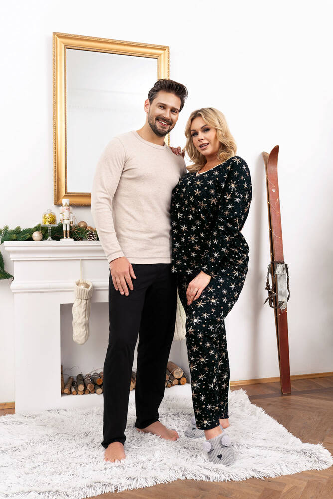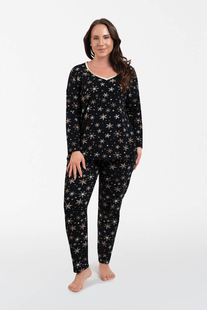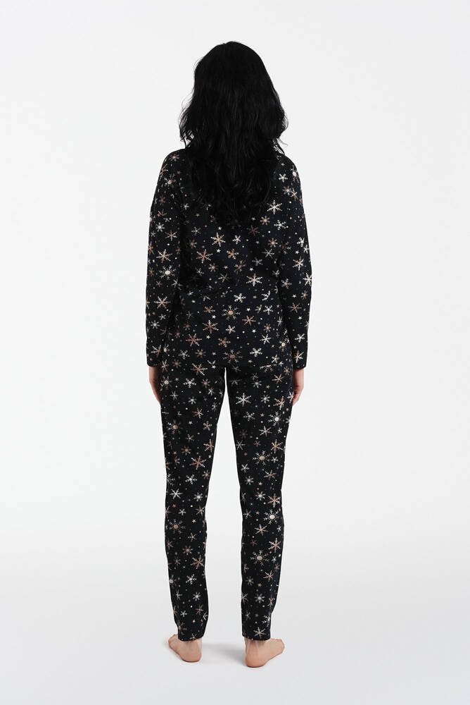 Perfektní pyžamo na chladné noci? Nejen teplé, ale také... ve sněhových vločkách! Toto krásné dámské pyžamo zdobené krásným vzorem sněhových vloček jistě potěší každou ženu. Bavlněné pyžamo má rovný střih, který neomezuje v pohybu a zaručuje pohodlí. Dámské pyžamo s dlouhými rukávy a dlouhými kalhotami má výstřih zakončený ozdobným saténem. Roztomilé sněhové vločky jsou po celém pyžamu. Toto módní dámské pyžamo je k dispozici ve velikostech S až XXL, v černé barvě s béžovými odstíny.