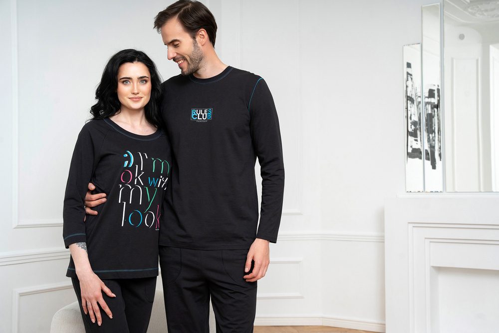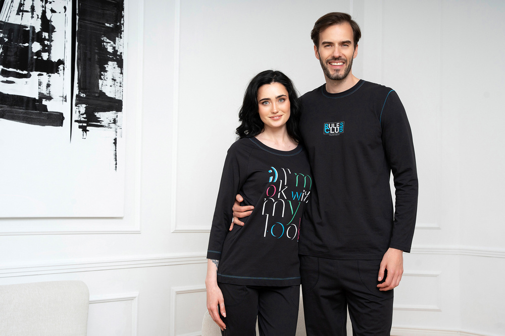Dámské pyžamo s ¾ kalhotami a ¾ halenkou se hodí na teplejší noci. Přírodní materiál udrží pokožku prodyšnou a příjemnou, zatímco rovný střih zajistí pohodlí a volnost pohybu. Mikina dámského bavlněného pyžama je zakončena kulatým výstřihem a uprostřed má ozdobnou grafiku - zajímavý nápis - vyrobený velmi odolnou metodou sítotisku. Pyžamové kalhoty mají naopak funkční kapsy. Módní dámské pyžamo je k dispozici ve velikostech S až XXL a v černé barvě s barevnými nápisy.