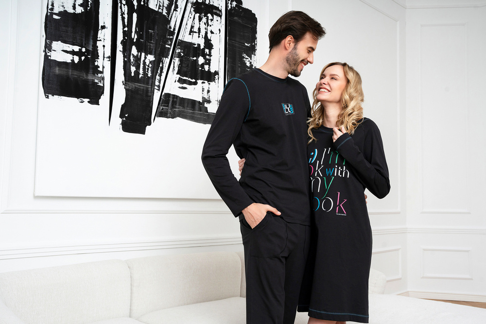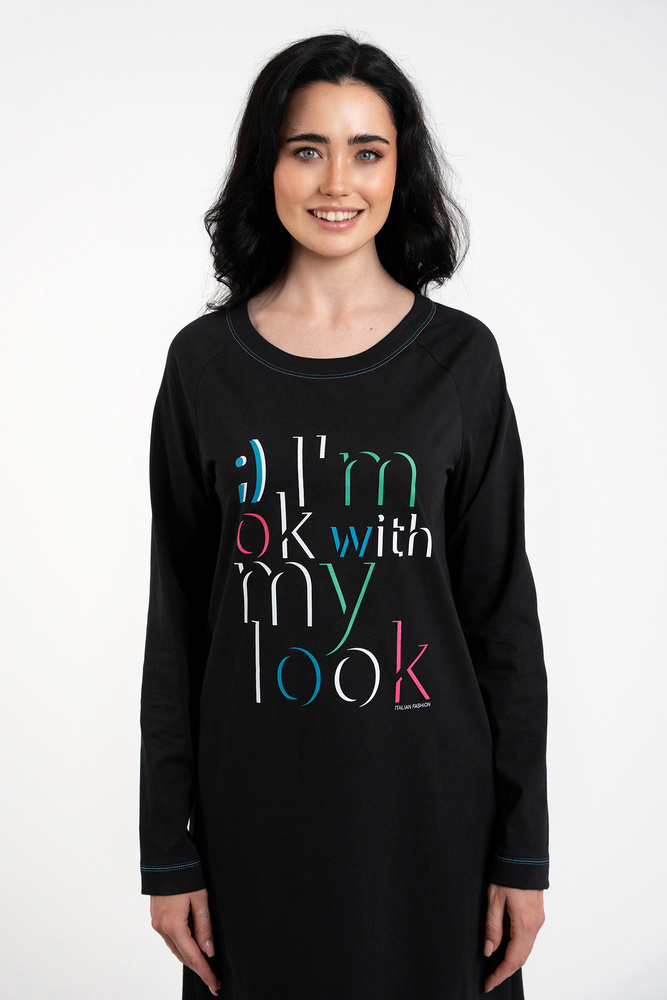Módní noční košile vám zpříjemní každou noc. Přírodní materiál umožní pokožce dýchat, zatímco rovný střih a délka pod kolena zajistí pohodlí a volnost pohybu. Dámské tričko na spaní má klasický kulatý výstřih a přední stranu zdobí atraktivní grafika - barevný sítotiskový nápis, který zůstane na svém místě i po mnoha vypráních. Styl této zajímavé dámské noční košile jistě osloví každou ženu. Bavlněná noční košile dostupná ve velikostech S až XXL a v černé barvě.