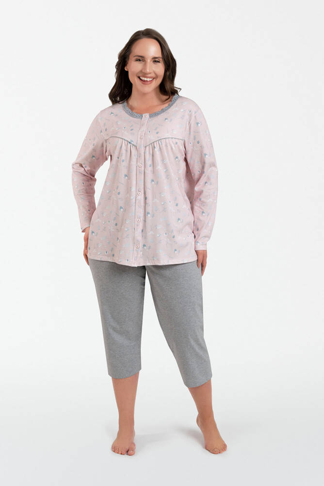 Tato pyžama jsou ideální volbou pro ženy, které si cení elegance i v noci! Dámské pyžamo s ¾ kalhotami a dlouhými rukávy zaujme svým jedinečným střihem. Její mikina, která je celá zapnutá na knoflíky, má kulatý krajkový výstřih a stylové prošívání nad poprsím. Kalhoty jsou naproti tomu zcela rovné. Díky tomu je toto dámské pyžamo trochu retro a vypadá velmi zajímavě. Vzor žaludů na mikině dodává mikině kouzlo. Bavlněné dámské pyžamo vám poskytne komfort a pohodlí během spánku a umožní vaší pokožce volně dýchat. Dámské stylové pyžamo je k dispozici ve velikostech M až XXXL, v odstínech růžové a melanžově šedé.