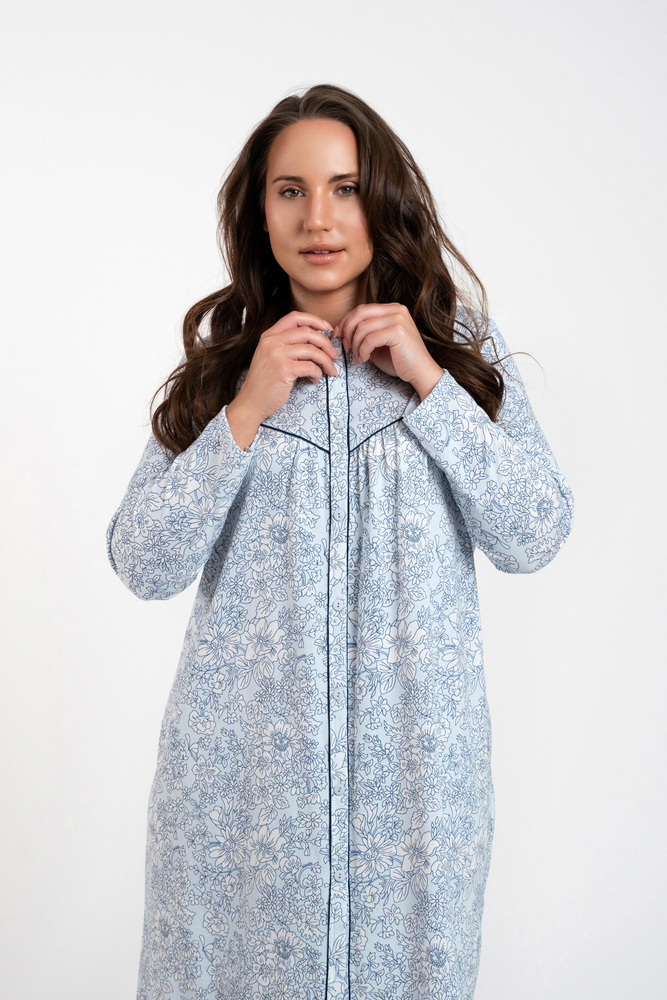 Dámská noční košile s dlouhými rukávy je ideální volbou pro letní i chladnější noci. Příjemná 100% bavlna poskytne dostatečný tepelný komfort a jemný květinový motiv osloví každou ženu. Dámská noční košile je rozepínací až dolů a má také zaoblený výstřih a ozdobné prošívání pro větší atraktivitu. Dámské bavlněné tričko na spaní je zárukou pohodlí a svobody každou noc. Dámská noční košile je k dispozici ve velikostech M až XXXL a v modrobílém barevném provedení.