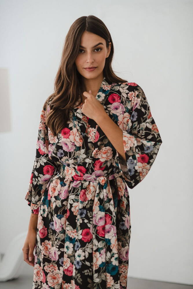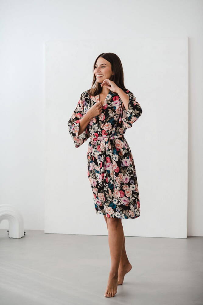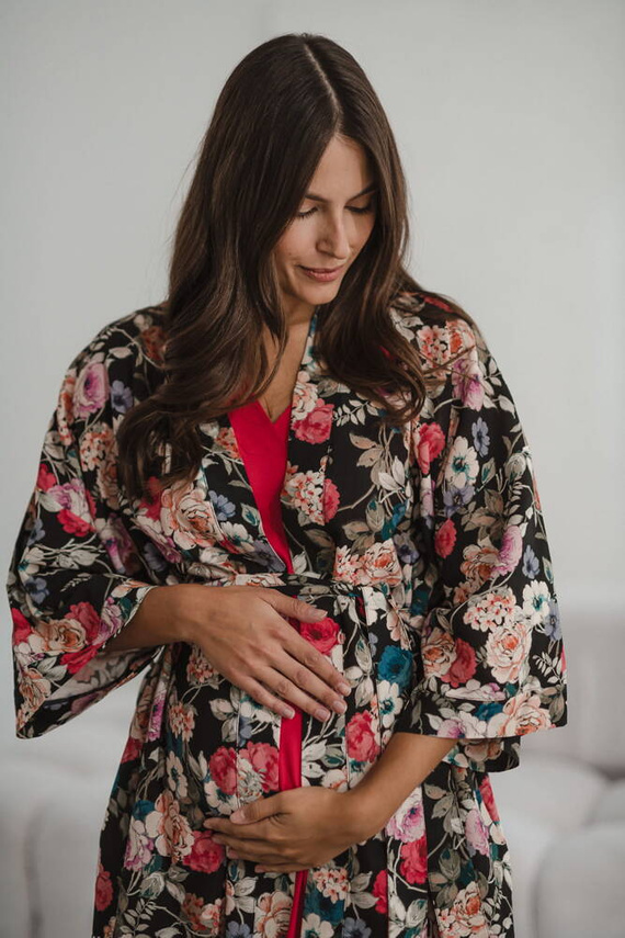 Szlafrok został zaprojektowany z myślą o mamach, dlatego jest nieco dłuższy, abyś spokojnie okryła nim ciążowy brzuszek. Po porodzie bez skrępowania b będziesz mogła spacerować po szpitalnym korytarzu lub na leżąco nakarmiła maluszka w połogu. Posiada kieszenie na niezbędne drobiazgi i pasek do regulowania szerokości.
