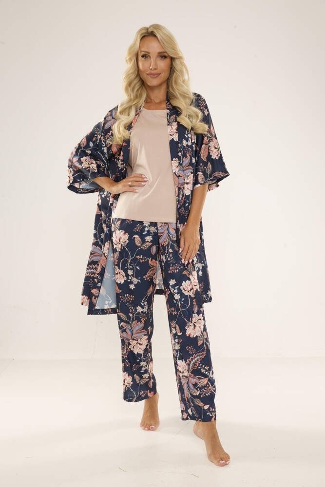 Pohodlný a okouzlující saténový komplet sestávající z halenky a kalhot. Halenka s krátkými rukávy, kulatý výstřih. Dlouhé kalhoty, vzorované. Zjsou střižené tak, aby se pohodlně nosily a zároveň sexy zdůrazňovaly křivky hýždí.