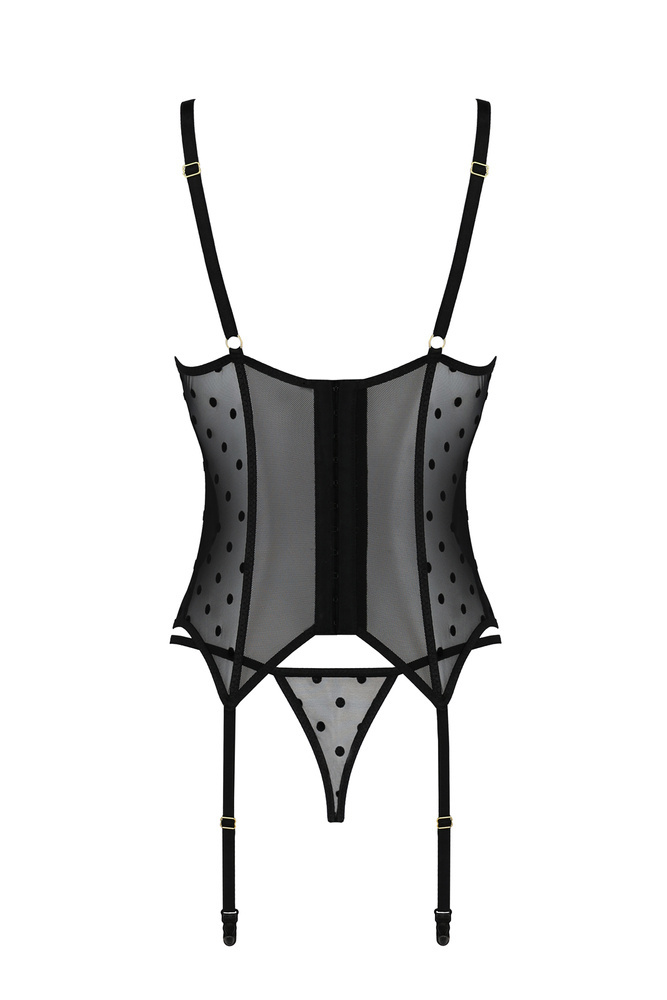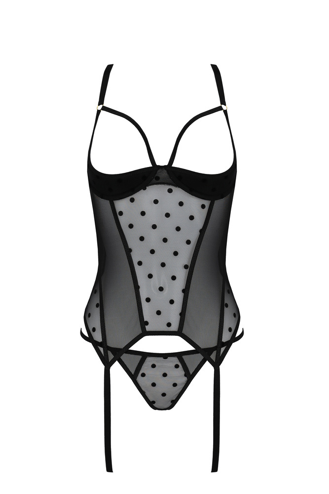 Velmi fenomenální korzet Martina je kombinací průhledného tylu s mimořádně vkusným tečkovaným vzorem. Horní část korzetu má otevřené košíčky. Poprsí je vyztužené díky použití velrybích kostí a výztuh. Sada obsahuje krásná tanga. Sada je k dispozici ve dvou barevných provedeních - černé a béžové.