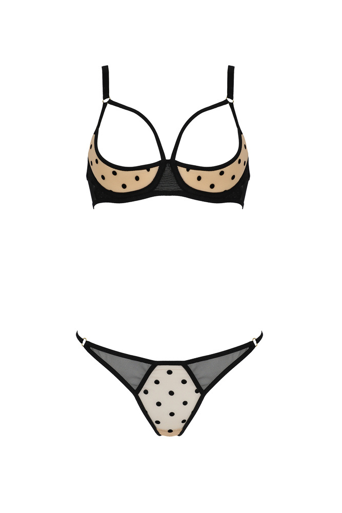 Souprava Marina se skládá ze dvou částí - tanga a podprsenka. Podprsenka je model s polootevřenými košíčky a ramínky obepínajícími prsa. Efekt? Sexy odhalená prsa, svůdná. Spojení tečkovaného tylu je fantastickou kombinací nevinnosti a mega sexy. Sada se dodává ve dvou barevných provedeních: béžové a černé.