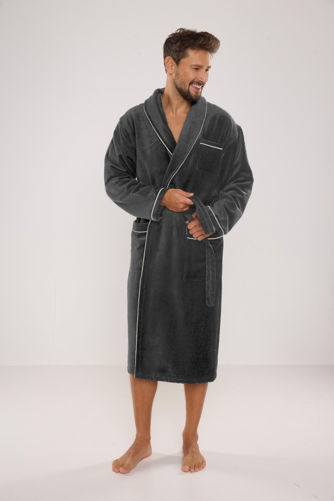 Pánský dlouhý velurový župan. Model s šálovým límcem, zavazováním v pase, dvěma kapsami na bocích a jednou na hrudi. Wz 50 % měkké froté bavlny. Material příjemné s měkkým omakem a vynikající absorpcí vody.