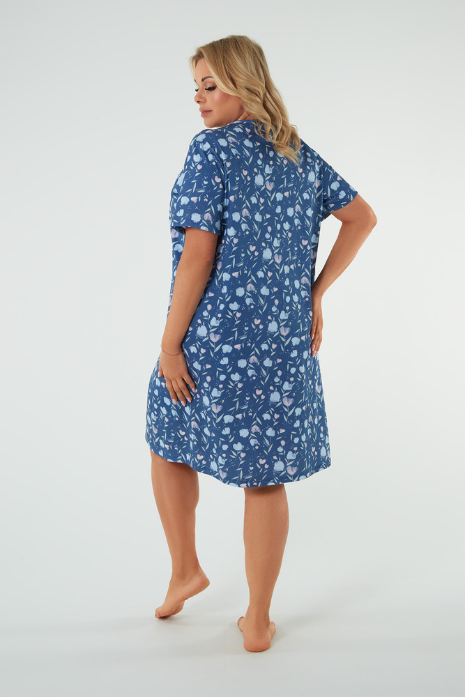 Noční košile s krátkými rukávy je vyváženou kombinací elegance, jemnosti a pohodlí. Má volný střih, který volně obepíná postavu. Dámská noční košile má na přední straně výstřih do V a ozdobné záhyby. Ve výstřihu je ozdobná saténová mašle. Celoplošný květinový potisk, který dodává lehkost a ženský půvab. Naše bavlněná noční košile má délku ke kolenům.