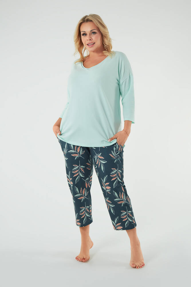 Dámské pyžamo pro ženy, které si cení elegance a pohodlí. Má uvolněný střih, který jistě ocení mnoho žen. Jednobarevná halenka se srdíčkovým výstřihem a 3/4 dlouhými rukávy. Druhou část dámské pyžamové soupravy tvoří kalhoty v délce 7/8 se vsazenými kapsami a výrazným potiskem listů, který přináší spoustu půvabu. Stojí za to dodat, že se jedná o pyžamo z bavlny - měkké, pohodlné a příjemné na dotek. Všechny jsou k dispozici v nadčasových, jemných barvách, takže si můžete vybrat ideální model pro vás.