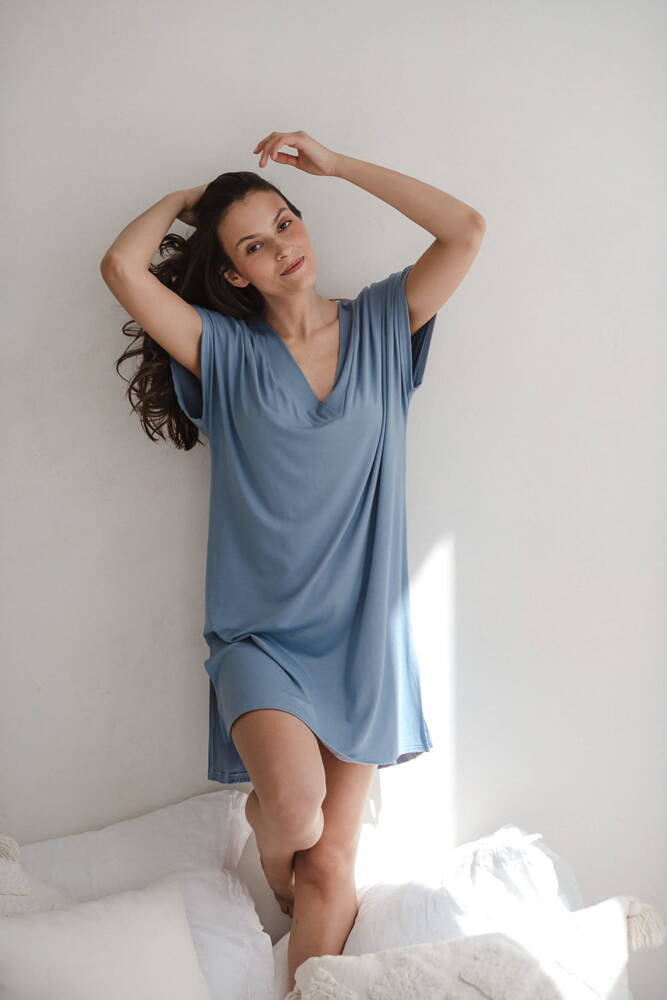 Koszula uszyta z wysokogatunkowej wiskozy bambusowej z dodatkiem elastanu, dzięki czemu nie "wyciąga się" i po praniu wraca do pierwotnego kształtu. Niezwykle elastyczna, dlatego świetnie sprawdzi się jako sukienka porodowa.