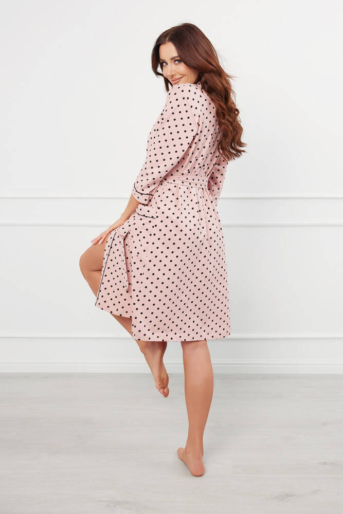 Dámský tenký župan Bonilla kombinuje pohodlí s klasickým stylem. Je vyrobena z jemné 100% bavlny, která zaručuje vynikající prodyšnost a měkkost. Jemný pudrově růžový odstín ladí s černými puntíky a černým lemováním a dodává celkovému vzhledu sofistikovaný nádech. Model s ¾ rukávy se vyznačuje rovným střihem, který dobře sedí na různých typech siluet, zatímco zavazovací pásek v pase pomáhá zvýraznit postavu. Délka ke kolenům poskytuje pohodlí a volnost pohybu, takže je ideální volbou pro ranní i večerní relaxaci.