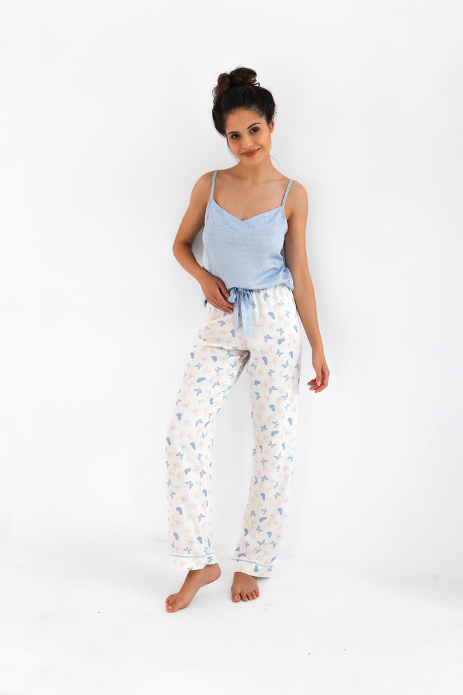 Dámské letní pyžamo se vzorem motýlů. Tričko bez ramínek. S volnými dlouhými kalhotami. Pásek s gumou a vázanou stuhou.