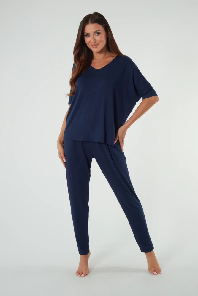 Sada z viskózy je vhodná pro všechna roční období. Viskóza chrání pokožku před chladem, ale struktura této tkaniny je prodyšná, takže účinně reguluje tělesnou teplotu. Měkká a na dotek velmi příjemná viskóza navíc poskytuje mimořádné pohodlí během spánku, kterého je dosaženo díky netlačící gumě v nohavicích a volnému střihu. Půvab sady dodává originální a lehce rozvolněný střih. Je ideální volbou pro ty, kteří dávají přednost pohodlí a třídě.