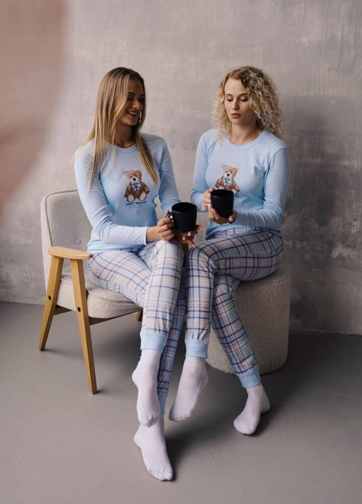 Dámské pyžamo Katrin se vyznačuje mírně vypasovanou linií, která poskytuje pohodlí a zvýrazňuje siluetu. Halenka s dlouhými rukávy má kulatý výstřih a ozdobný potisk s roztomilým medvídkem a nápisem "Sweet Dreams" Italská móda Guazzone. Kalhoty klasického střihu s módním kostkovaným vzorem ve spodní části nohavic mají praktické šňůrky, které drží kalhoty na místě a zabraňují jejich vyhrnování během spánku.