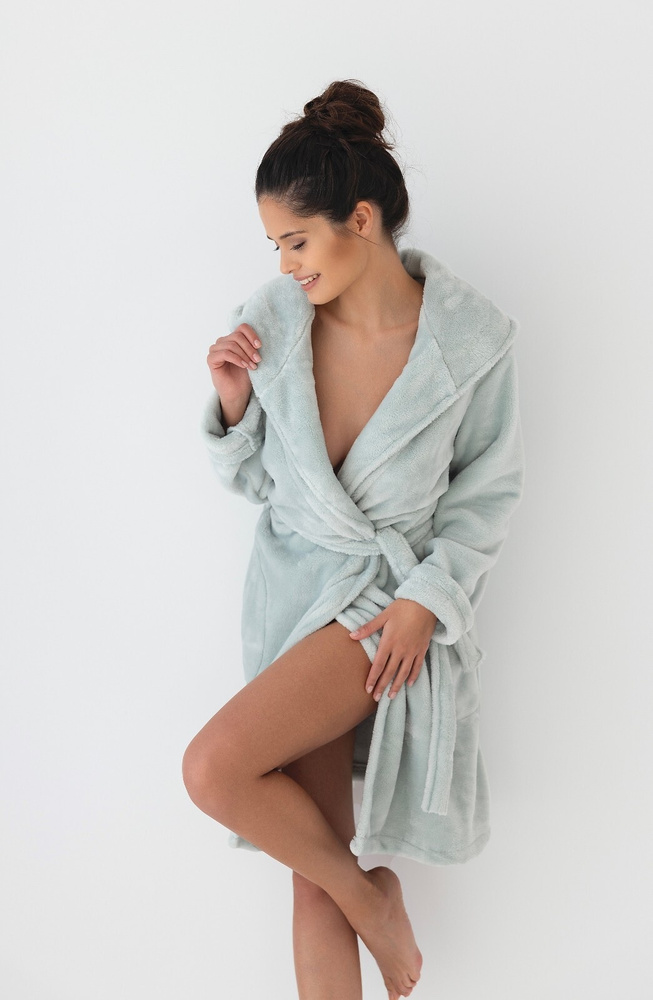Dámský župan z příjemné a měkké pleteniny. Model s dlouhými rukávy a kapucí. Funkční kapsy na úrovni boků. Zavazování v pase zvýrazňuje siluetu.