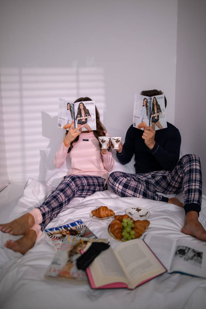 Toto pánské pyžamo má jednoduchý a pohodlný střih. Top je halenka s kulatým výstřihem s lemováním a dlouhými rukávy. Je jednobarevná s módním prošíváním ve spodní části. Soupravu doplňují kalhoty s klasickým kostkovaným vzorem. Mají dvě praktické kapsy na bocích. Model je vhodný i pro použití jako pyžamo pro mládež.