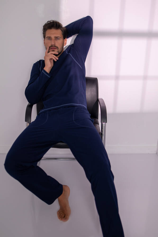Zde jsou perfektní pánská pyžama pro chladnější noci. Blůza pyžama má pohodlný střih s praktickými dlouhými raglánovými rukávy. Má také kulatý výstřih s výrazným lemováním. Souprava se dále skládá z dlouhých kalhot s vyznačenými kapsami. Charakteristickým znakem tohoto modelu je výrazné prošívání na ramenou, rukávech a na spodním okraji halenky. Celá látka je vyrobena z měkké, hladké a na dotek příjemné bavlny a je v jedné univerzální barvě. .