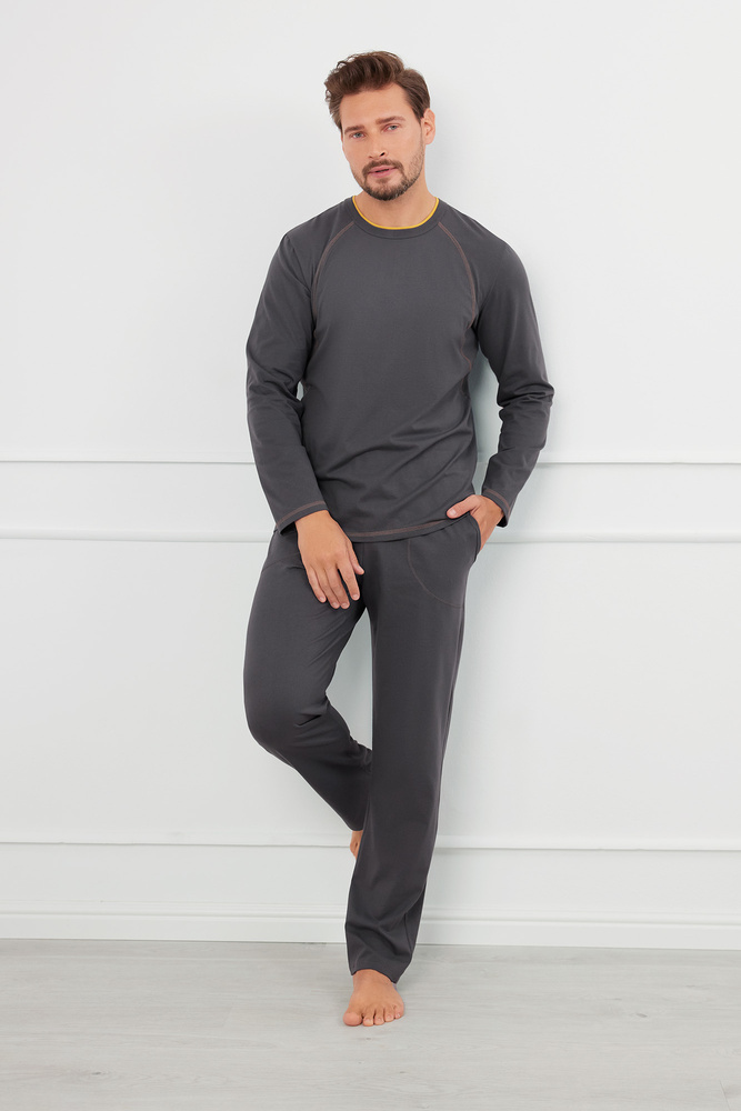 Zde jsou perfektní pánská pyžama pro chladnější noci. Blůza pyžama má pohodlný střih s praktickými dlouhými raglánovými rukávy. Má také kulatý výstřih s výrazným lemováním. Souprava se dále skládá z dlouhých kalhot s vyznačenými kapsami. Charakteristickým znakem tohoto modelu je výrazné prošívání na ramenou, rukávech a na spodním okraji halenky. Celá látka je vyrobena z měkké, hladké a na dotek příjemné bavlny a je v jedné univerzální barvě. .