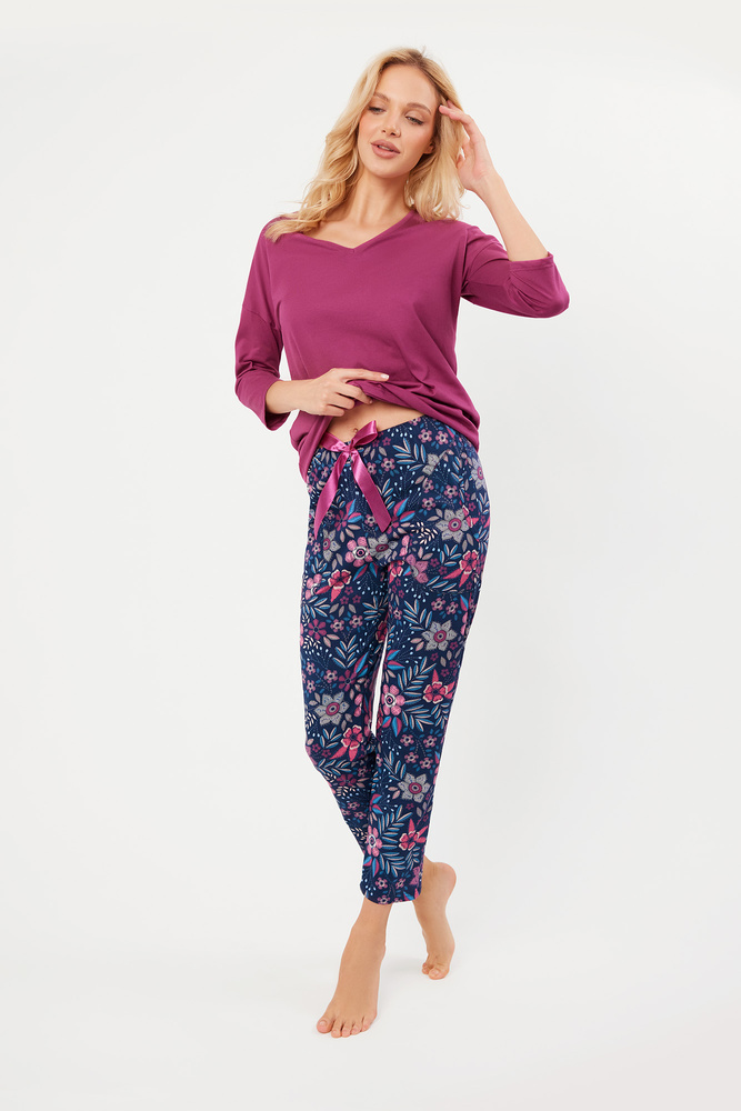 Naše dámská pyžama ze 100% bavlny jsou kvintesencí stylu a pohodlí. Má jednoduchý střih, který se hodí nejen na noc, ale i na ranní a večerní lenošení. Top s ¾ dlouhými rukávy je pestrý s výstřihem do V. Je udržována v jednolité barvě. Spodní část elegantního dámského pyžama tvoří 7/8 kalhoty s květinovým potiskem a saténovou mašlí. Ideální volba pro každodenní nošení i výlety.