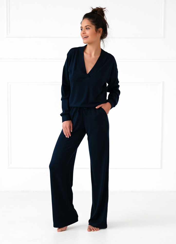 Dámská souprava domácího oblečení. Vyrobeno z vysoce kvalitní pleteniny s příměsí viskózy. Tričko s dlouhými rukávy, výstřih do V. S volnými dlouhými kalhotami. Elastický pás.