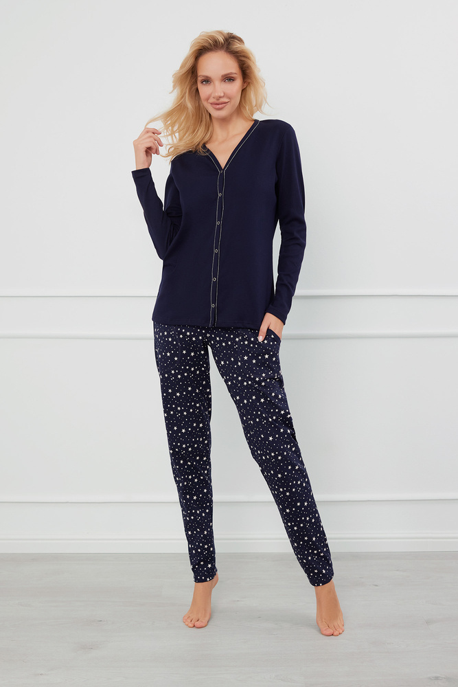 Dámské pyžamo bez knoflíků z bavlněného žebrovaného úpletu, které se vyznačuje nadčasovým designem. Má klasický střih s dlouhými rukávy a výstřihem do V, který je lemován jemnou nití v kontrastní barvě. Dlouhé kalhoty s módním potiskem hvězdiček upoutají pozornost. Praktické, vložené kapsy na bocích. Přidejte skutečnost, že se jedná o dámské pyžamo bez knoflíků, a jasně označený panel s knoflíky dodá celému vzhledu noblesu a půvab.