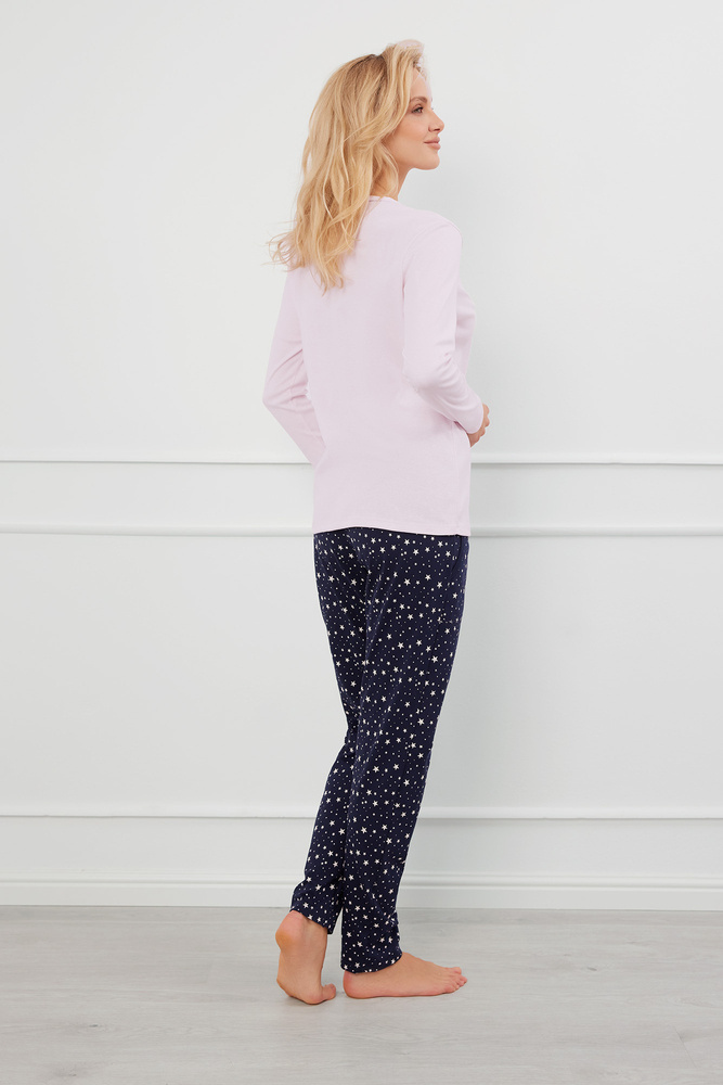Dámské pyžamo bez knoflíků z bavlněného žebrovaného úpletu, které se vyznačuje nadčasovým designem. Má klasický střih s dlouhými rukávy a výstřihem do V, který je lemován jemnou nití v kontrastní barvě. Dlouhé kalhoty s módním potiskem hvězdiček upoutají pozornost. Praktické, vložené kapsy na bocích. Přidejte skutečnost, že se jedná o dámské pyžamo bez knoflíků, a jasně označený panel s knoflíky dodá celému vzhledu noblesu a půvab.