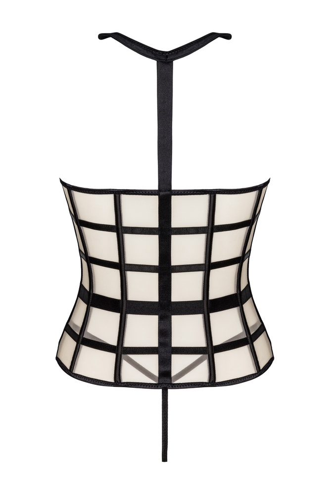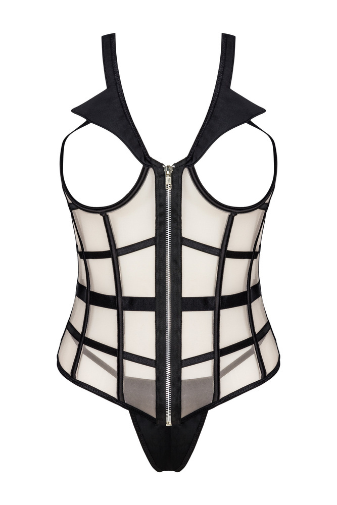 Dvoudílná souprava skládající se z korzetu a tang bude ideální pro všechny dámy, které rády odhalují své půvaby. Korzet se vpředu zapíná na zip pro snadné oblékání. Barevné schéma sady je černé a béžové, které společně vytvářejí atraktivní kombinaci. Sadu doplňují samolepky na bradavky, které jsou skvělým zpestřením.
