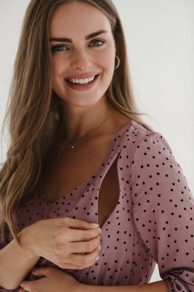 Lovely Dress sukienka ciążowa i do karmienia rękaw 3/4 Milk&Love liliowa w czarne groszki