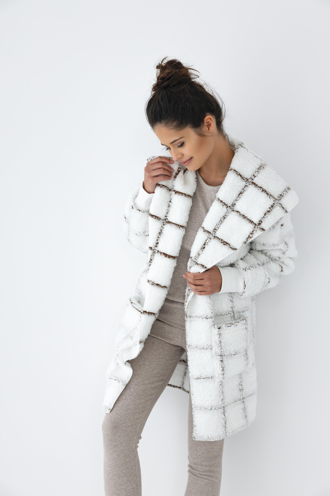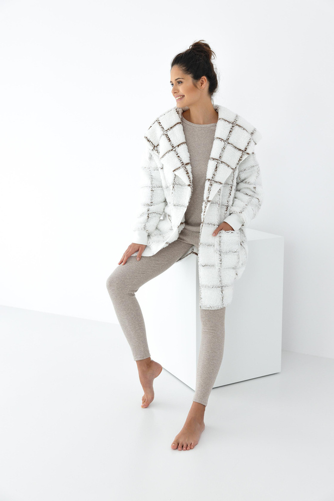 Pohodlný dámský župan. Vyrobeno z měkkého, nadýchaného měkkého úpletu. Model do poloviny stehen, rovný střih s dlouhými rukávy. Na úrovni boků má dvě kapsy. Velmi pohodlný střih, jemně přizpůsobený tělu. Osloví ženy, které milují jemnost a volnost.