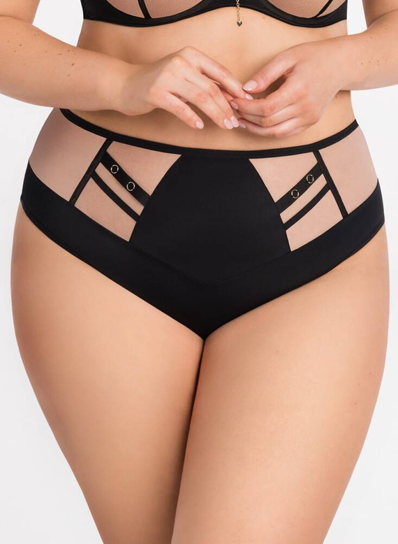 Otevřená rána pokrývající téměř celou hýždě. Kalhotky z mikrovlákna. Švy kryté matnými páskami. Ozdobné pruhy z gumiček na přední straně. Zadní strana zakončená zastrčením mikrovlákna do roviny. Bavlněný rozkrok.