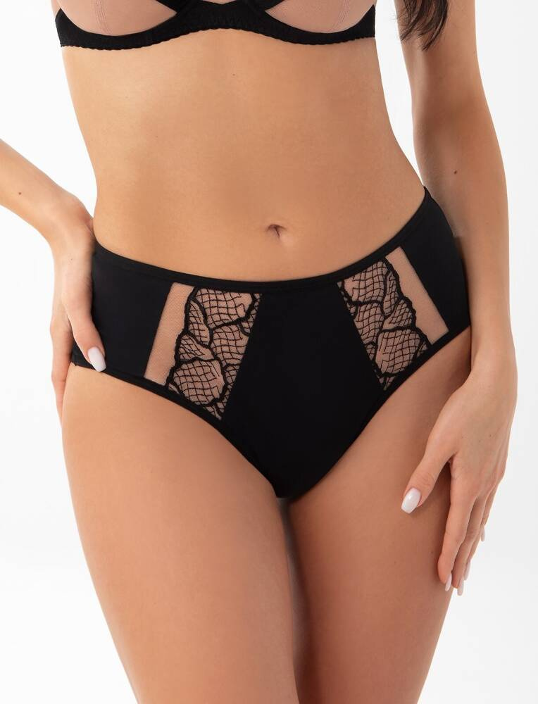 Spodní díl bikin z mikrovlákna. Částečně odhaluje a zvýrazňuje hýždě. Vyšívané tylové vsadky na přední straně. Hladká záda