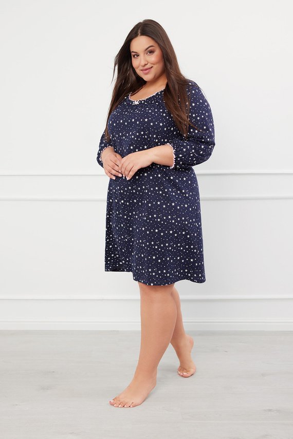 Romantická noční košile z příjemné hladké bavlny je ideálním modelem pro dámy, které ocení ženskost a pohodlí. Má volný střih a kulatý výstřih doplněný kontrastním lemováním. Pod ním je saténová mašle. Má také praktické 3/4 rukávy a délku ke kolenům. Na dámské noční košili však nejvíce vyniká půvabný potisk hvězd.