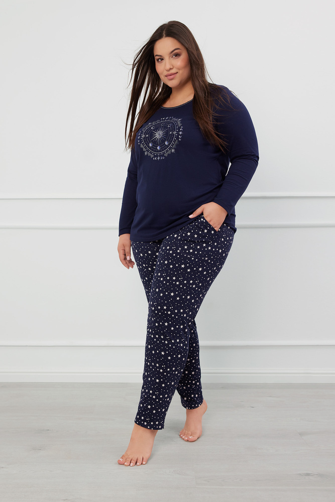 Stylové dámské pyžamo zdobené vesmírným motivem. Celý kus je vyroben z měkkého bavlněného žerzeje. Má klasický, pohodlný střih. Módní top s potiskem měsíční fáze dokonale ladí se spodním dílem s hvězdičkami. Celý kus má dlouhé rukávy a dlouhé nohavice. Jedná se o dámské bavlněné pyžamo, které se vyznačuje měkkostí, hebkostí a vysokou odolností proti roztažení.