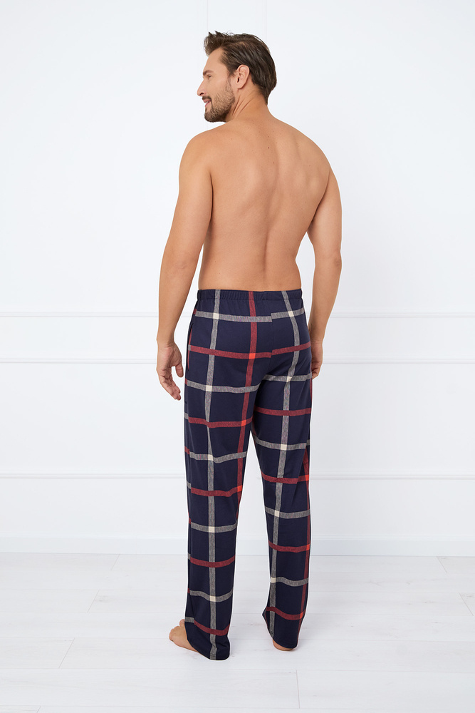 Pánské pyžamové kalhoty jsou vyrobeny z měkké 100% bavlny, mají rovný střih a zdobí je široký károvaný vzor v odstínech námořnické, bílé a červené barvy, který jim dodává elegantní a zároveň nadčasový vzhled. Na bocích mají praktické kapsy, které poskytují další funkčnost. Pas kalhot je obohacen o ozdobnou šňůrku, která podtrhuje stylový vzhled.