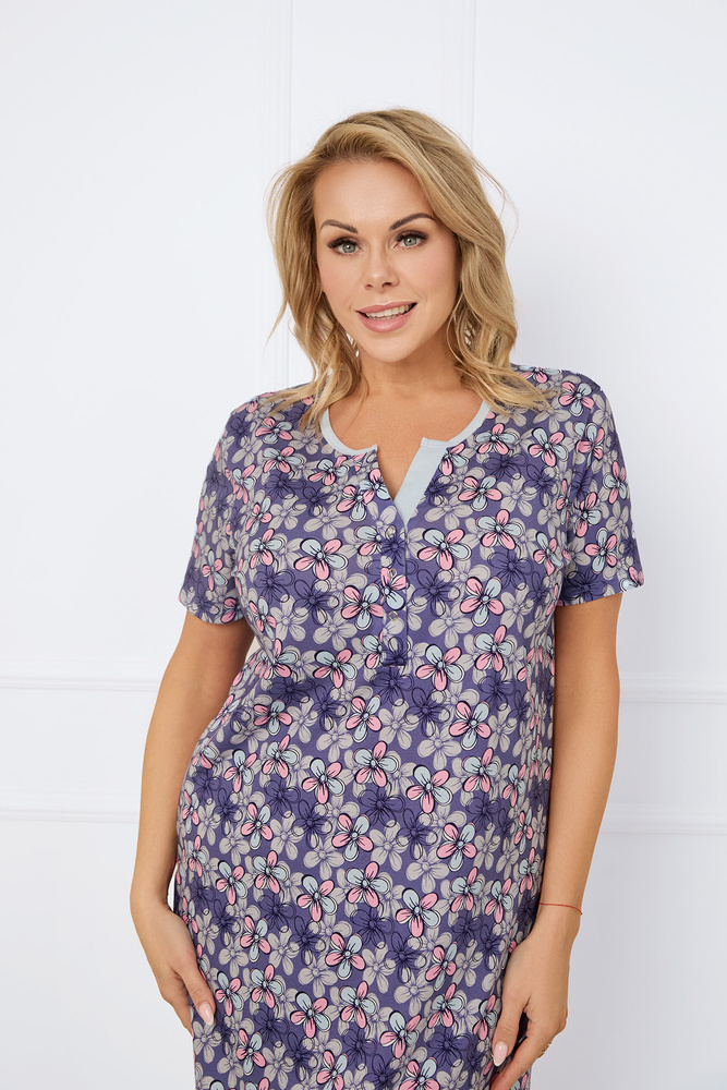Dámská noční košile je kombinací romantiky a elegance. Má pohodlný střih s krátkým rukávem. Tílko má kulatý výstřih s kontrastním lemováním a výrazné zapínání na knoflíky polo. Květinový potisk, jemně zdobený po celé ploše, dodává stylizaci ženskou jemnost. Tento praktický model s délkou ke kolenům je vyroben z měkké 100% bavlny.