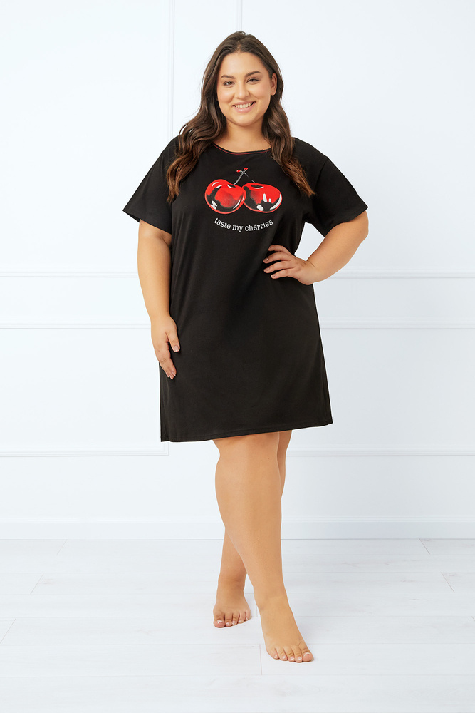 Dámská noční košile s krátkým rukávem je určena ženám, které milují hravé potisky. Byl ozdoben motivem třešní a sloganem "Taste my cherries". Má pohodlný, volný střih, který volně obepíná postavu. Top je zakončen kulatým výstřihem. Celkový design je ve výrazných, kontrastních barvách. Je vyroben z bavlny, která je měkká a snadno se udržuje.
