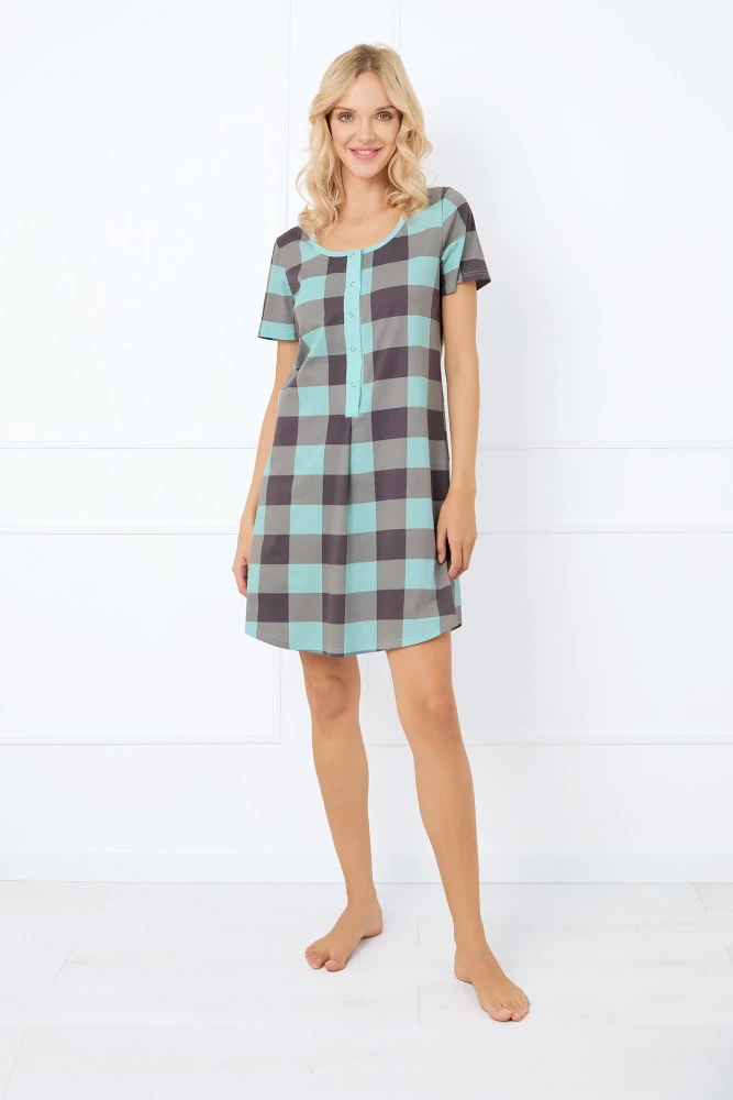 Dámská noční košile s krátkým rukávem a kojící košile má jednoduchý a pohodlný střih. Zdobí ho zapínání u krku na knoflíky. Model je zdoben kostkovaným vzorem, který dodává stylizaci velký půvab. Celý je vyroben z prodyšné bavlny, která je velmi prodyšná.