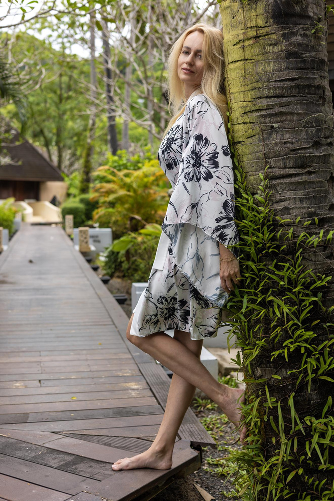 Uvolněný tvar s širšími rukávy dodává lehkost a eleganci. Pásek vám umožní nastavit si pas podle potřeby. Vysoce kvalitní vzorovaný satén. Plášť můžete použít také jako přehoz přes plavky.