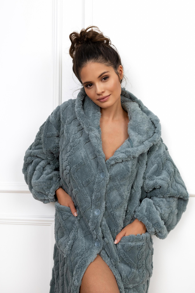 Dámský župan z příjemné a měkké pleteniny. Model s dlouhými rukávy a kapucí. Funkční kapsy na úrovni boků. Zapínání na knoflíky.