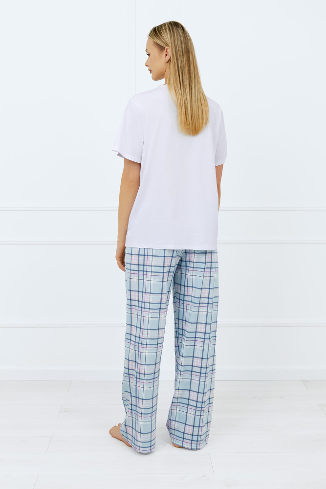 Dámské dlouhé pyžamové kalhoty z měkké 100% bavlny vynikají klasickým rovným střihem a stylovým širokým károvaným vzorem v odstínech tmavě modré, bílé a červené barvy. Díky tomu v sobě spojují eleganci a nadčasový design, který se skvěle hodí na každou noc. Pohodlný elastický pás, který netlačí, pro naprostou volnost pohybu a pohodlí při nošení. Bonusem jsou praktické kapsy na bocích, které zvyšují funkčnost. Je ideální volbou pro ženy, které ocení styl a pohodlí domova.