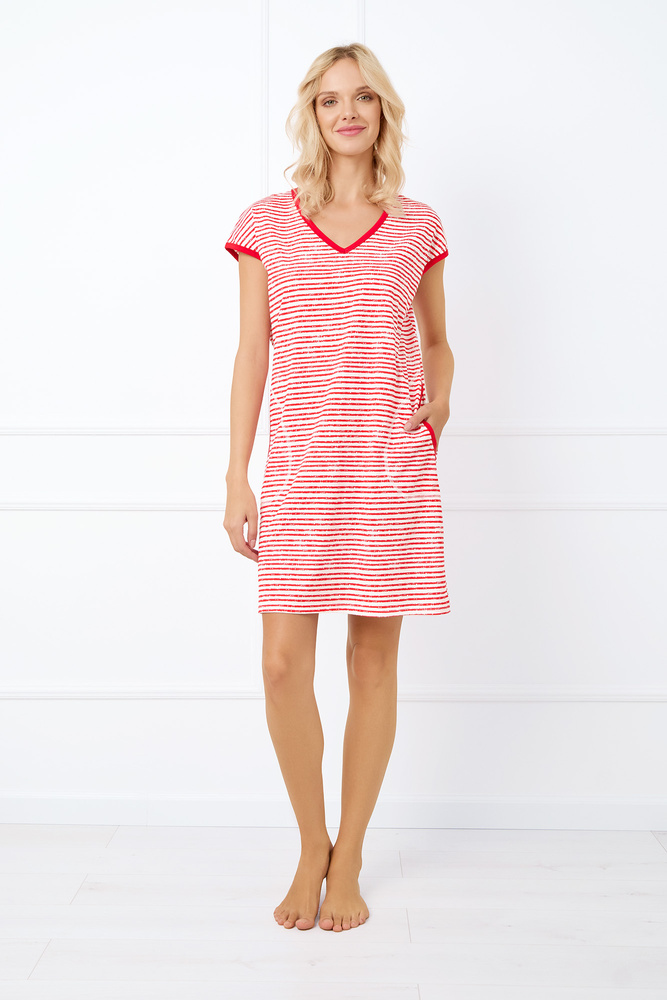 Dámská noční košile s krátkým rukávem inspirovaná námořnickým stylem je skvělou volbou pro teplé dny. Má rovný střih a celoplošný pruhovaný potisk. Je zakončena výstřihem do V, lemovaným kontrastním lemováním - podobné detaily jsou i na rukávech a kapsách. Vše vyrobeno ze 100% bavlny.