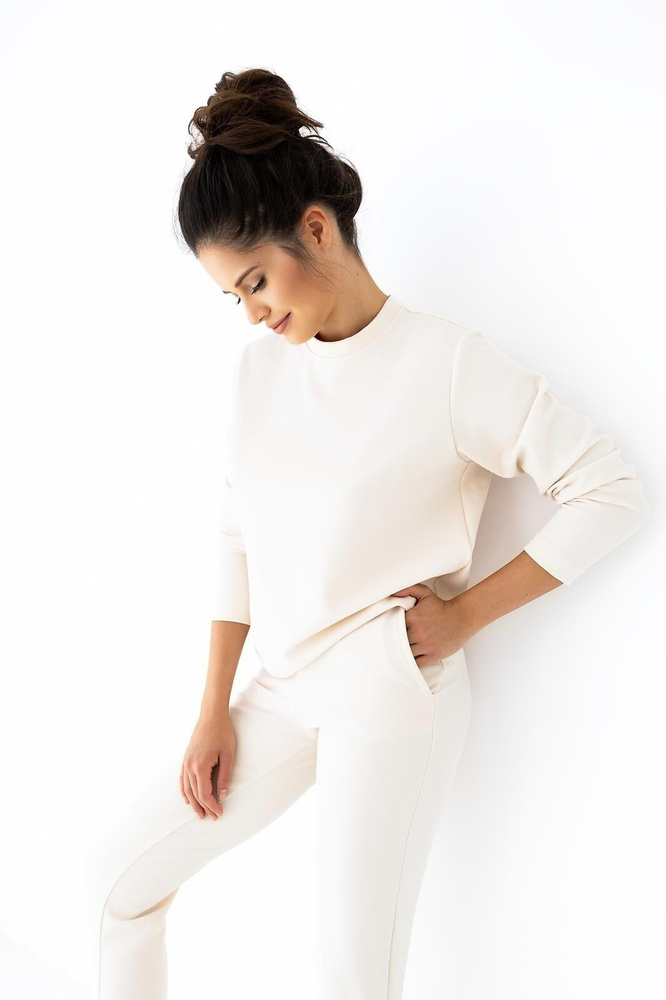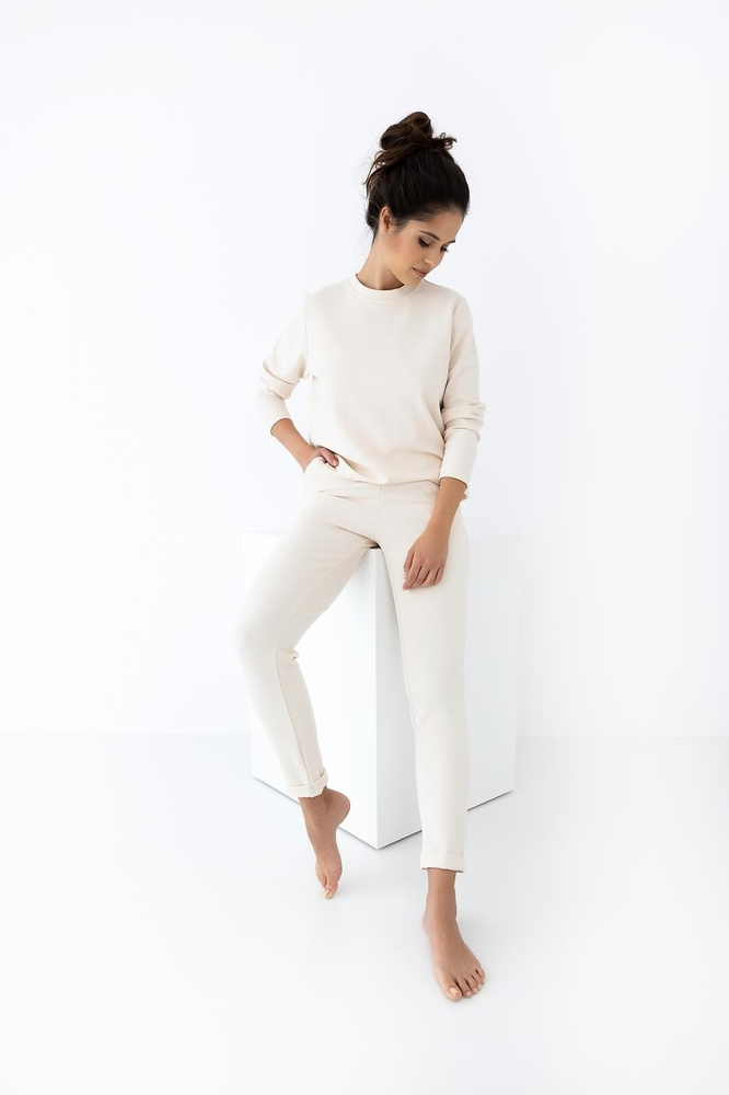 Pyžamo - dámská tepláková souprava z vysoce kvalitní pleteniny. Hladká mikina s dlouhými rukávy. Pas a manžety s žebrovanými konci. Dlouhé hladké kalhoty s kapsami, zakončené ohrnutou manžetou .