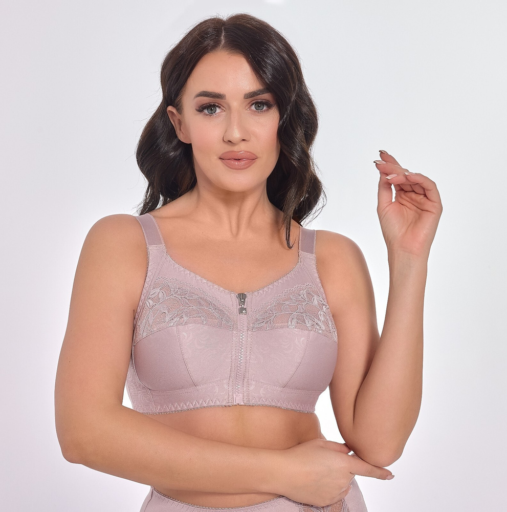 Biustonosz bez fiszbin. Stworzony został dla Pań z większym, pełnym biustem.  Innowacyjne zapięcie z przodu na suwak, które znacząco ułatwia zakładanie i zdejmowanie. Suwak od spodu posiada podszycie, które chroni ciało przed otarciami i zapewnia przyjemne dopasowanie. Wysoki środek dobrze podtrzymuje i zaokrągla biust.