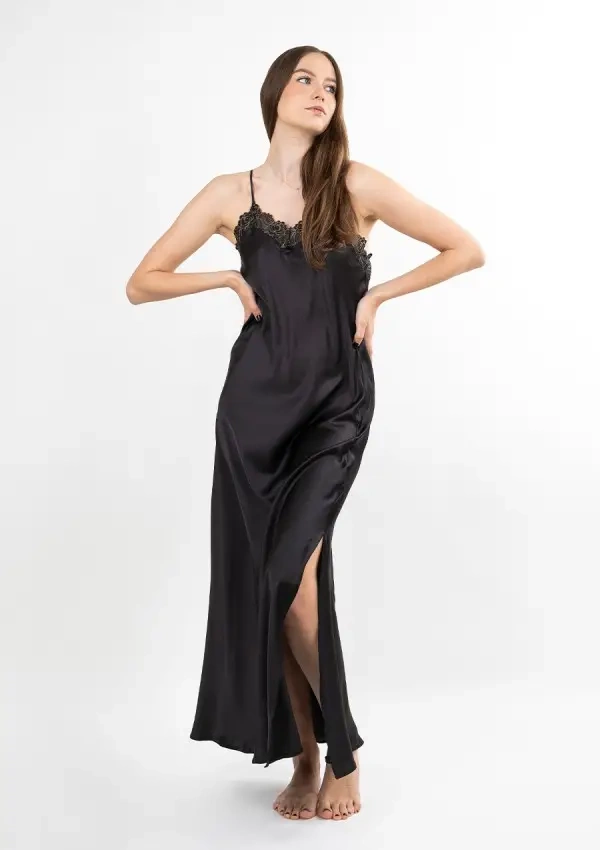 Rut saténový slip dlouhý černý Dkaren | elegantní noční slip bez ramínek
