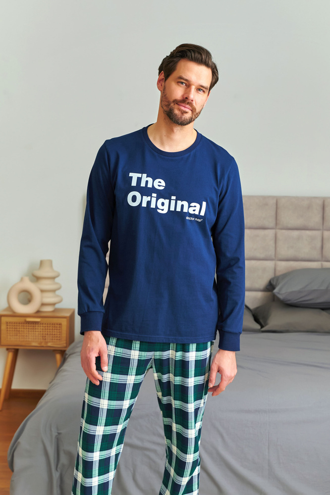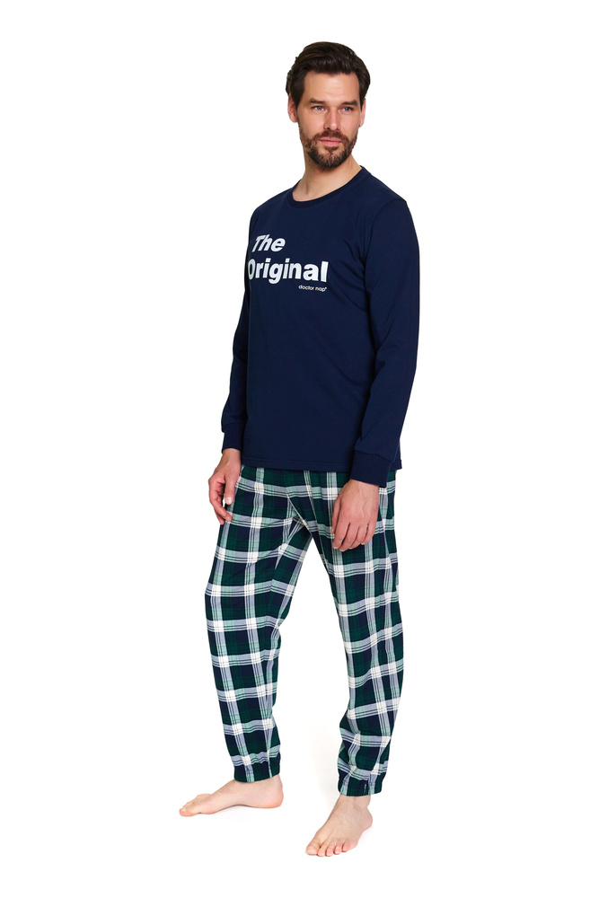 Pánské pyžamo Doctor Nap 7341 je stylový komplet ideální pro všechna roční období. Skládá se z bavlněné halenky s dlouhými rukávy a potiskem "The Original" a klasických kostkovaných kalhot s žebrovaným lemem. Tento model je součástí rodinné kolekce - můžete si vybrat sladěné soupravy pro partnera a dítě a vytvořit tak ucelený módní komplet pro společné večery nebo fotografie. Polská výroba zajišťuje kvalitu a pohodlí.
