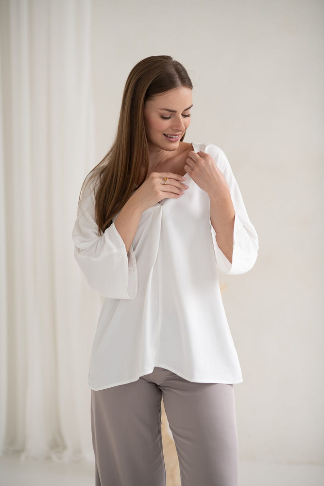 Mamafullness Těhotenská halenka pro kojící Milk&Love bílá - viskóza, 3/4 rukáv, oversize