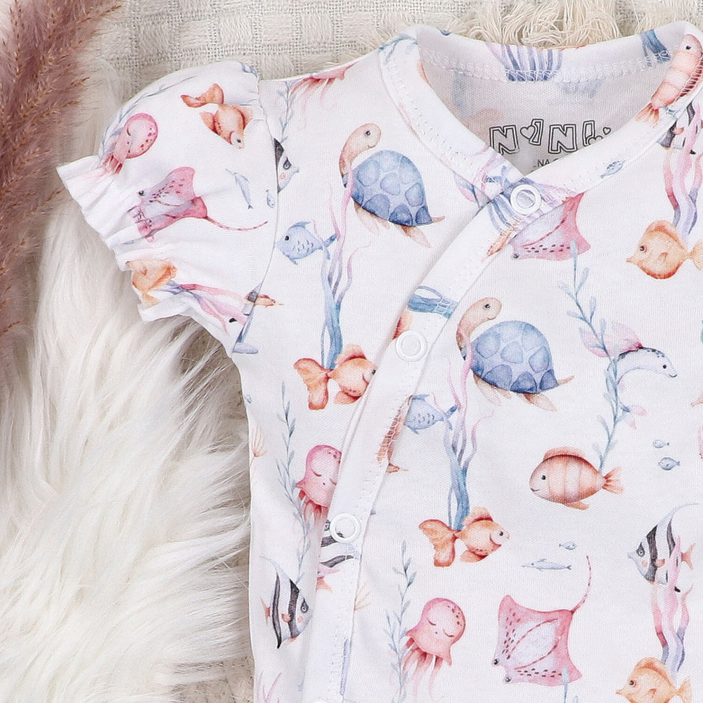 - Body Nini Underwater World - 100% organická bavlna, krátký rukáv, obálkový styl, pohodlné zapínání na druky.