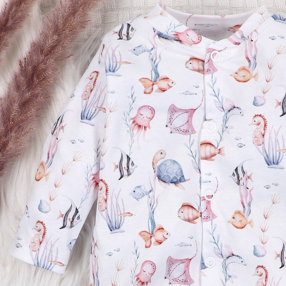 - Pyžamo Nini Underwater World - 100% organická bavlna, vestavěné nožičky, zapínání na patentky po celé délce.