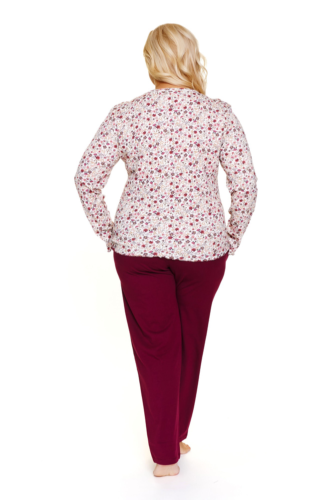Doctor Nap 7307 je pohodlné dámské pyžamo plus size určené pro pohodlný spánek a relaxaci. Halenka s dlouhými rukávy, jemným vzorem a praktickou knoflíkovou légou je ideální i pro kojící matky. Volné kalhoty pro naprostou volnost pohybu. Měkký bavlněný úplet s přídavkem elastanu (95 % bavlna, 5 % elastan) je příjemný k pokožce. Polská výroba je zárukou kvality a pečlivého zpracování.
